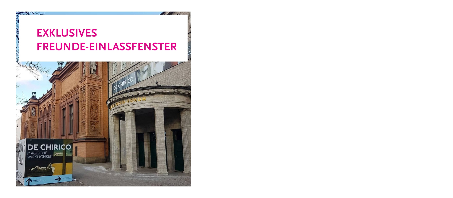 Am Donnerstag, 20. Mai 2021 von 9 bis 10 Uhr ist der Einlass in die Ausstellung „De Chirico. Magische Wirklichkeit“ ausschließlich Mitgliedern der Freunde der Kunsthalle vorbehalten!